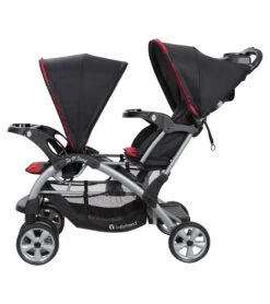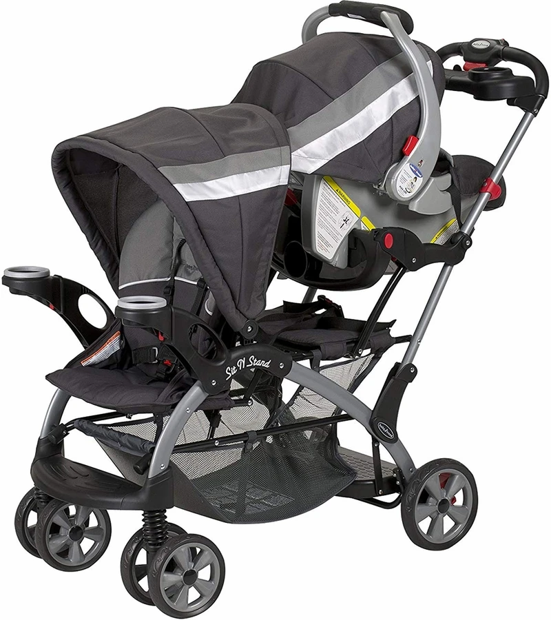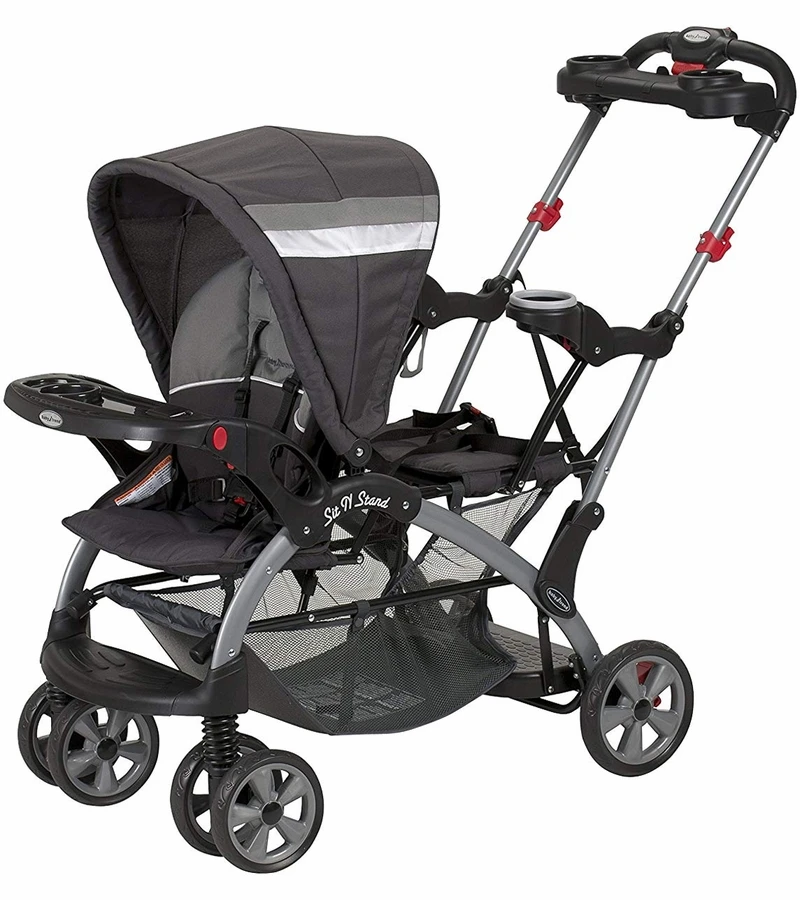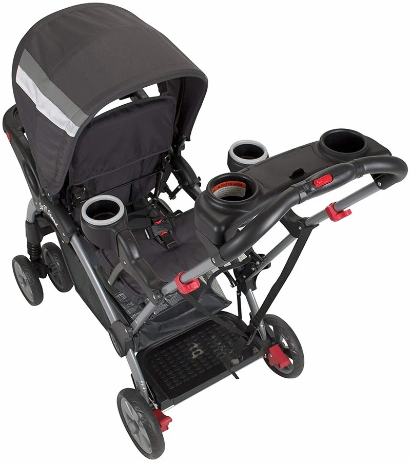 - Children can sit in the front and rear seats of this stroller or stand on the rear platform