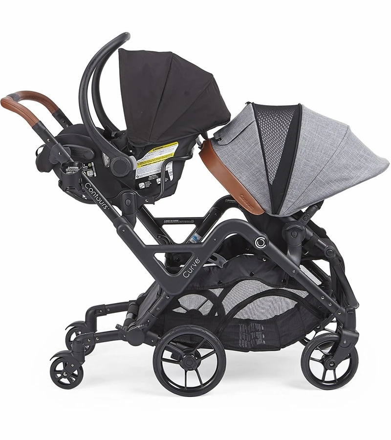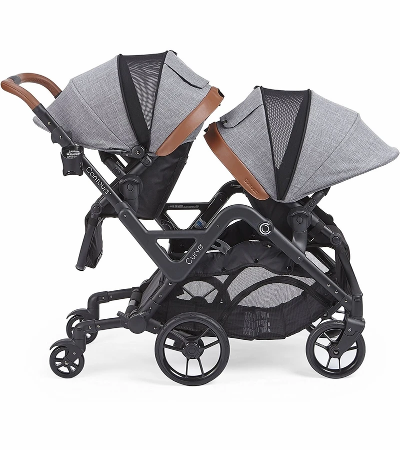 Whether cruising through the burbs or sightseeing in the city, the Contours Curve makes strolling with two children a breeze. Its unique 6-wheel design makes steering and 360° turning as easy as a single stroller. Specifically engineered to perform with the weight of two children, this stroller glides, pushes and turns effortlessly with one hand. In addition, the curb-assist feature facilitates easy handling over curbs.