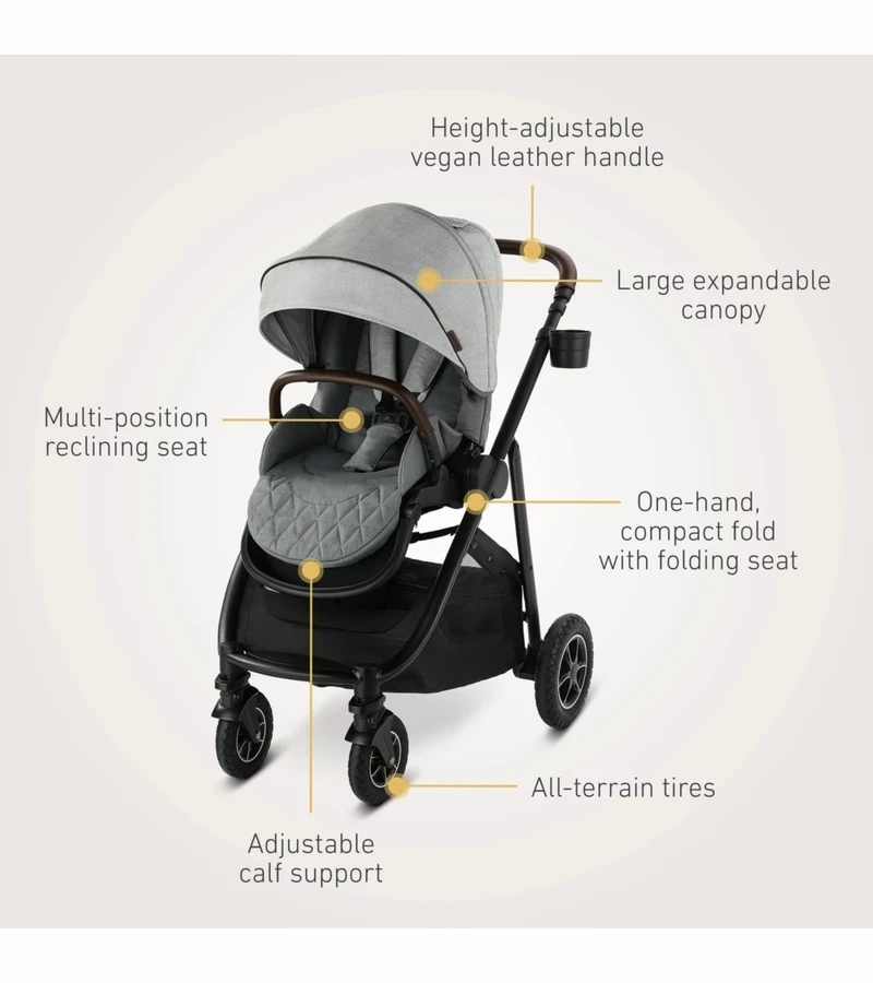 The Graco® Premier Midtown™ collection is tailored with premium materials and design. The Graco® Premier Modes™ Lux Stroller offers you and your child more ways to stroll together, from baby to big kid. It’s 3 strollers in 1—infant car seat carrier, infant carry cot, and toddler stroller—for a versatile stroll from infant to toddler (infant car seat and carry cot sold separately). With the Modes™ Lux Stroller, every ride is convenient as the seat folds in rear or forward-facing mode for easy, compact storage and transportation. Extra touches include a height-adjustable vegan leather handle and belly bar, calf support, in-seat suspension, parent cup holder, and a large canopy to ensure baby is comfortable for every stroll.