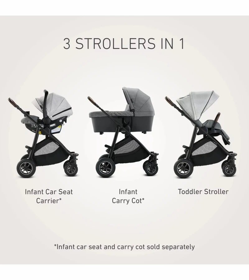 - 3 strollers in 1: infant car seat carrier, infant carry cot, toddler stroller (infant car seat and carry cot sold separately)