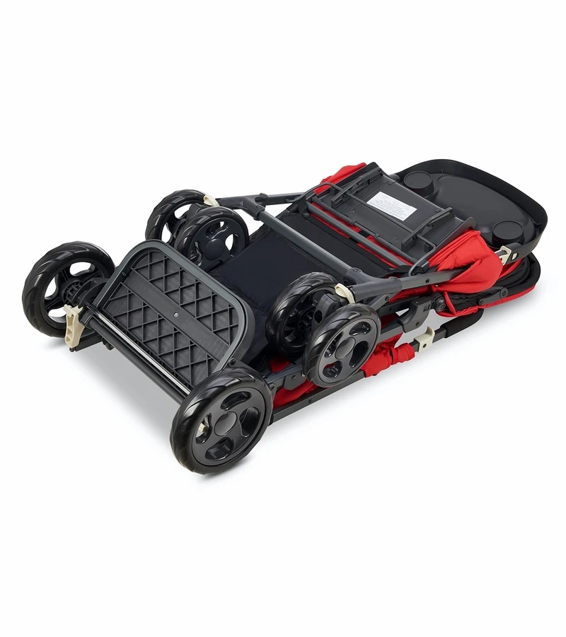 The Caboose Too is a double stroller for siblings, with a removable rear seat that gives your older child the option of sitting, using the bench, or even standing on the rear platform. Its four-wheel suspension ensures the smoothest ride ever, even with maximum capacity.