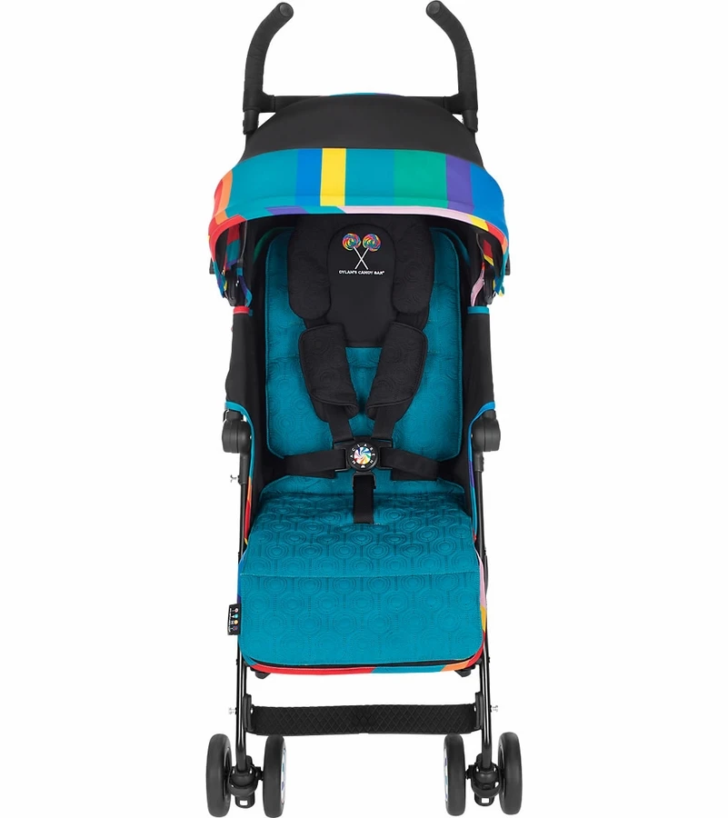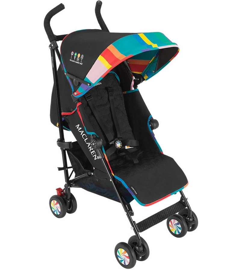 Dylan Lauren and Maclaren celebrate art, fashion and candy with this sleek black on black Quest buggy styled out in Dylan’s Candy Bar’s bold and playful patterns – adding a pep to every step. To further sweeten the deal, the one-handed seat recline and one foot operated buggy also includes a reversible quilted seat liner and premium wind-resistant raincover featuring a candy spill pattern, plus a universal organiser and headhugger & shoulder pads. The Dylan’s Candy Bar Quest is sure to awaken the creative spirit and inner child in everyone.