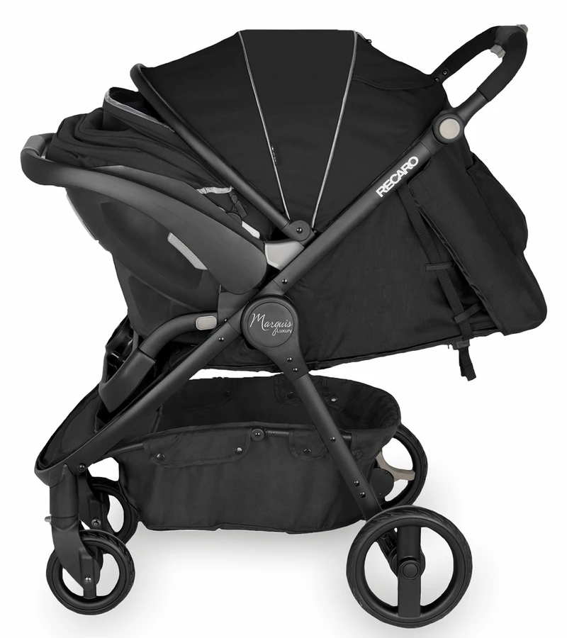 The RECARO Performance Marquis Luxury Stroller is designed to accommodate the RECARO Performance Coupe Infant Seat. It is travel system ready with QuickSnap, built-in adapters that require no assembly or extra parts. The adapter for the Performance Coupe is built in to the childs tray on the Performance Marquis Luxury. For added convenience, the 2-in-1 childs tray connects easily to the stroller and simply flips down to be used as an adapter. The Performance Marquis Luxury also comes with an included insect net to protect your little one from unwanted mosquitos, insects and other pests. The childs tray, infant seat adapters, insect net and the parent cup holder are all included with the Performance Marquis Luxury.
