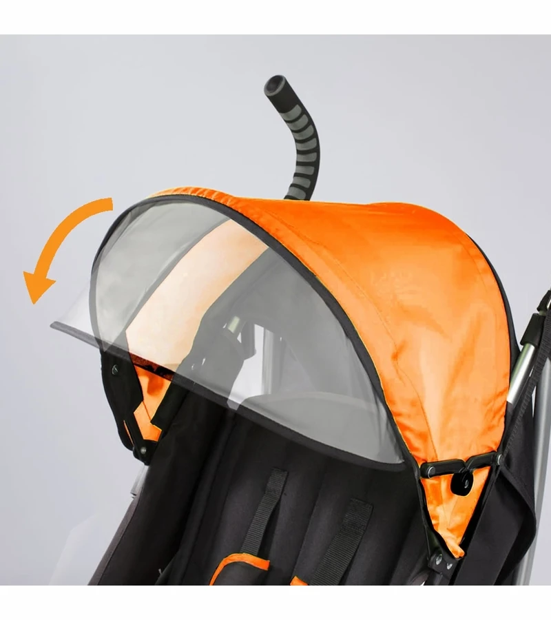 - Adjustable and removable canopy with flip out sun visor