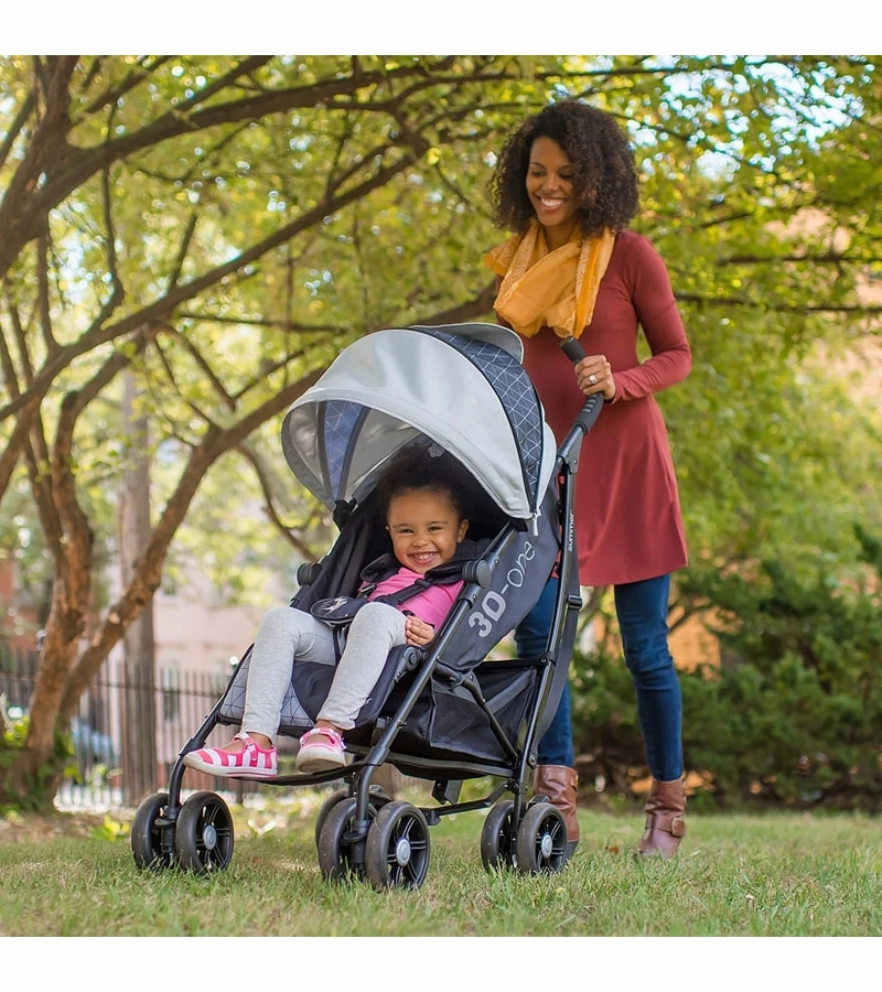 The one and only stroller mom will ever need. 3D-one combines the smooth ride and rich details found in a full size stroller with the compact, lightweight frame of a convenience stroller. Features include a one hand fold, one hand recline, one hand adjustable footrest, and a one hand adjustable canopy. You?ve finally found the one!