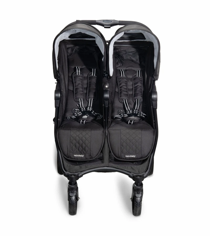 The Valco Baby Slim Twin Stroller is designed with small spaces in mind. At less then 26 inches wide, this lightweight double stroller will fit through even the smallest openings. Featuring an easy compact one hand fold, independent reclining seats, canopy extensions and adjustable foot rests and weighing under 24 lbs, the Slim twin is great double stroller for travel and inner city use.